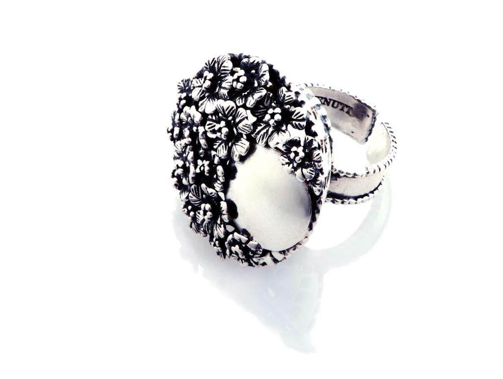 Ma c’è anche un tocco particolare, un tratto distintivo della mente di Francesca Catalbianco, come quel vuoto lasciato volutamente sull’anello disco. Un piccolo specchio d’argento, contornato da tanti fiori di mandorlo, in cui vedere ciò che vogliamo (o che desideriamo).